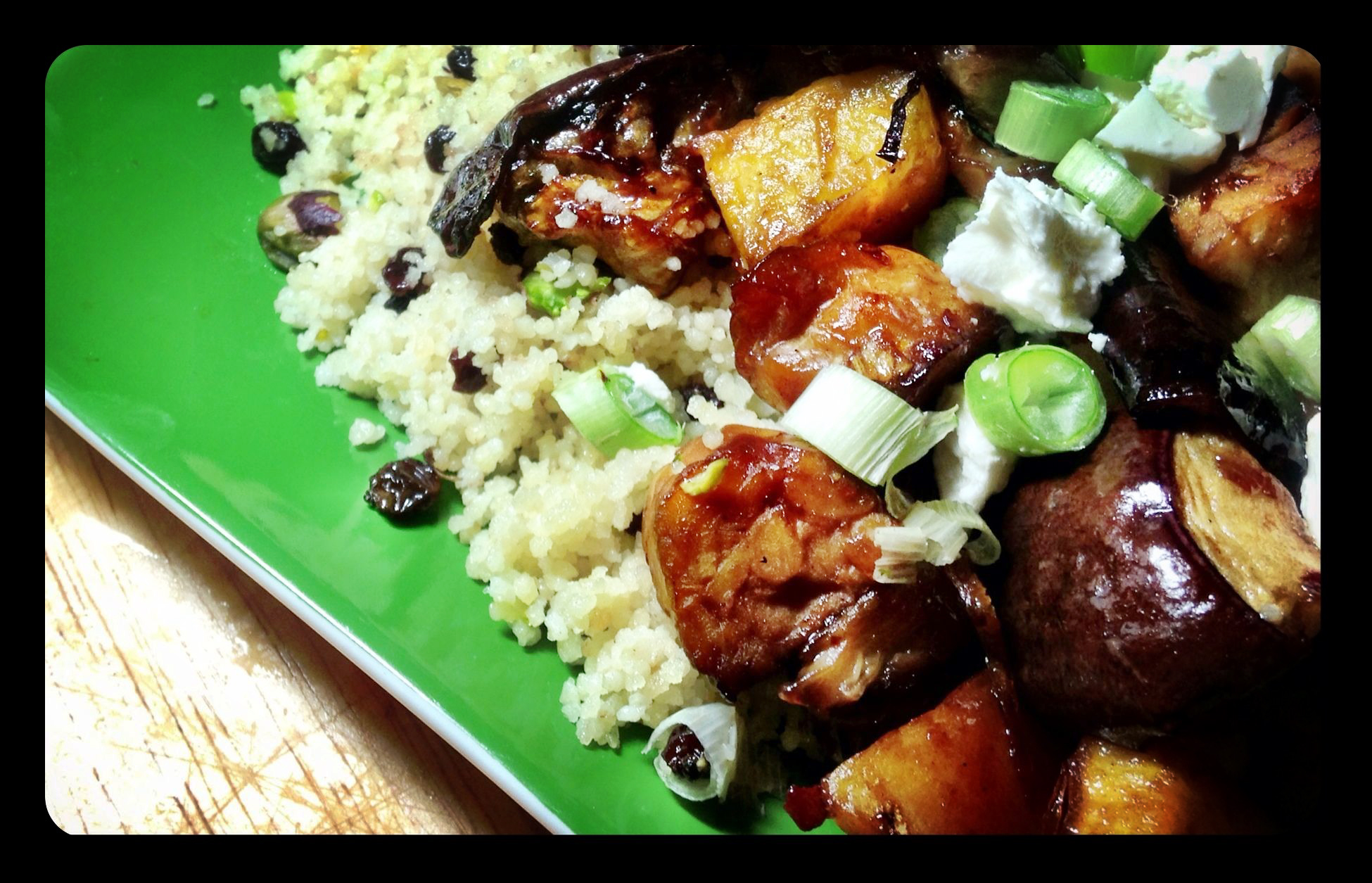 This recipe is Vegan, gluten and dairy free, if you leave off the feta. I served it over a bed of couscous made with currants, green/spring onions, and dry roasted pistachio nuts, but realistically it would go well with almost any grain or pulse: rice, wild rice, Israeli couscous, bulger, quinoa, etc . . .